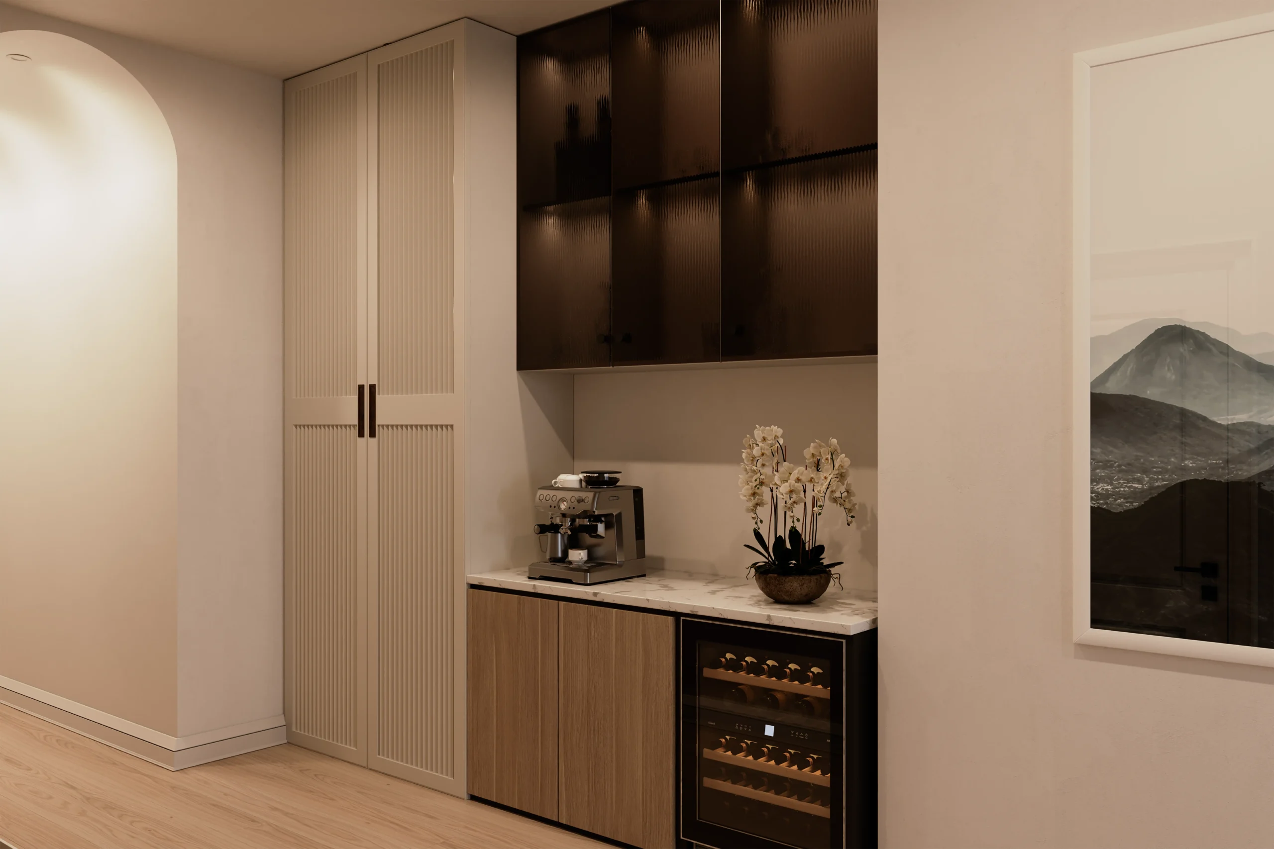 Floor-to-ceiling millwork offers sleek storage and visual impact.